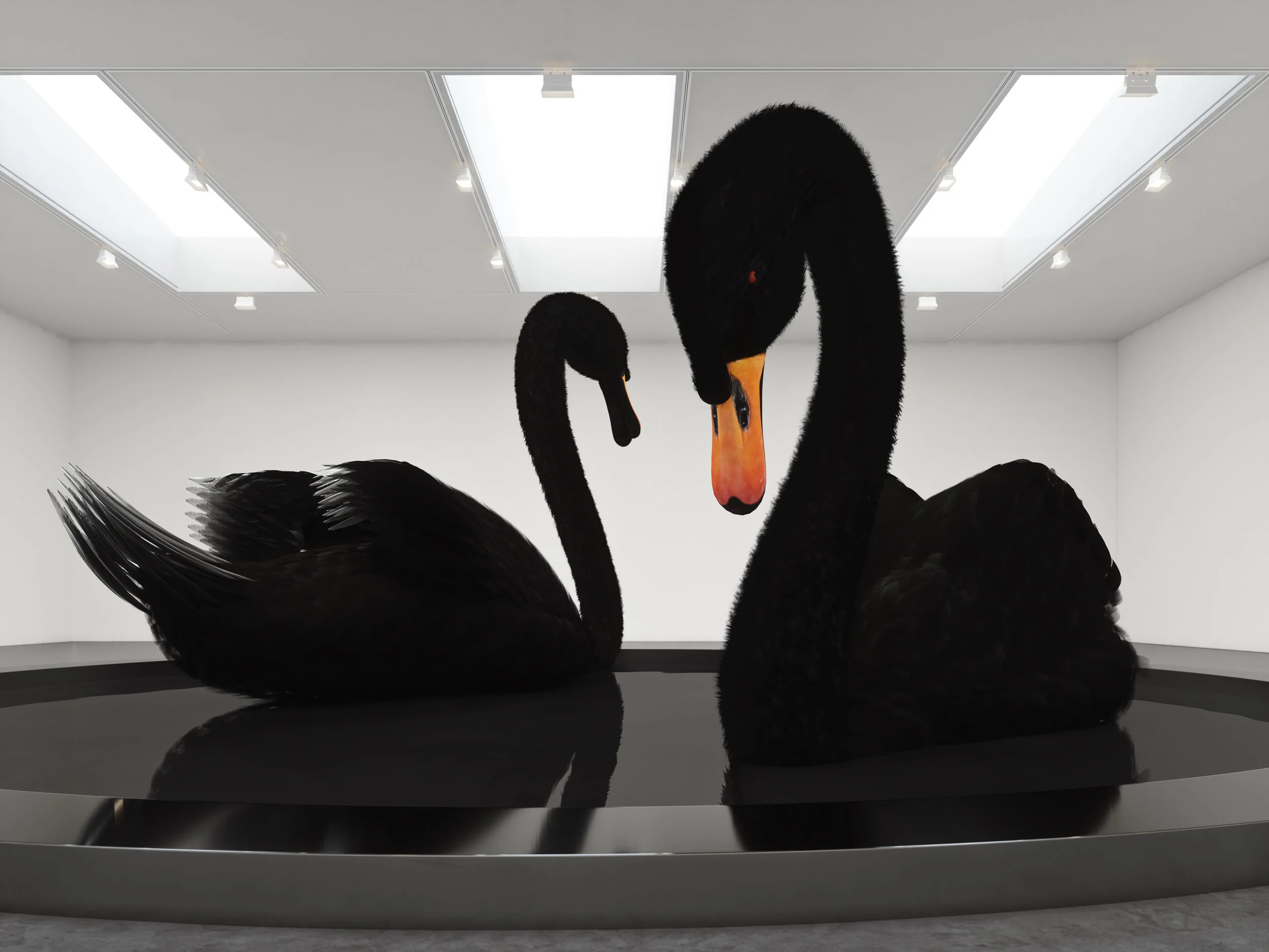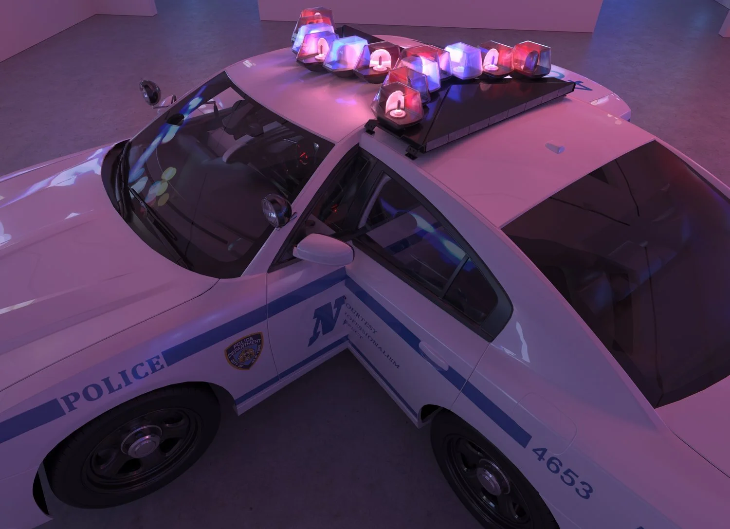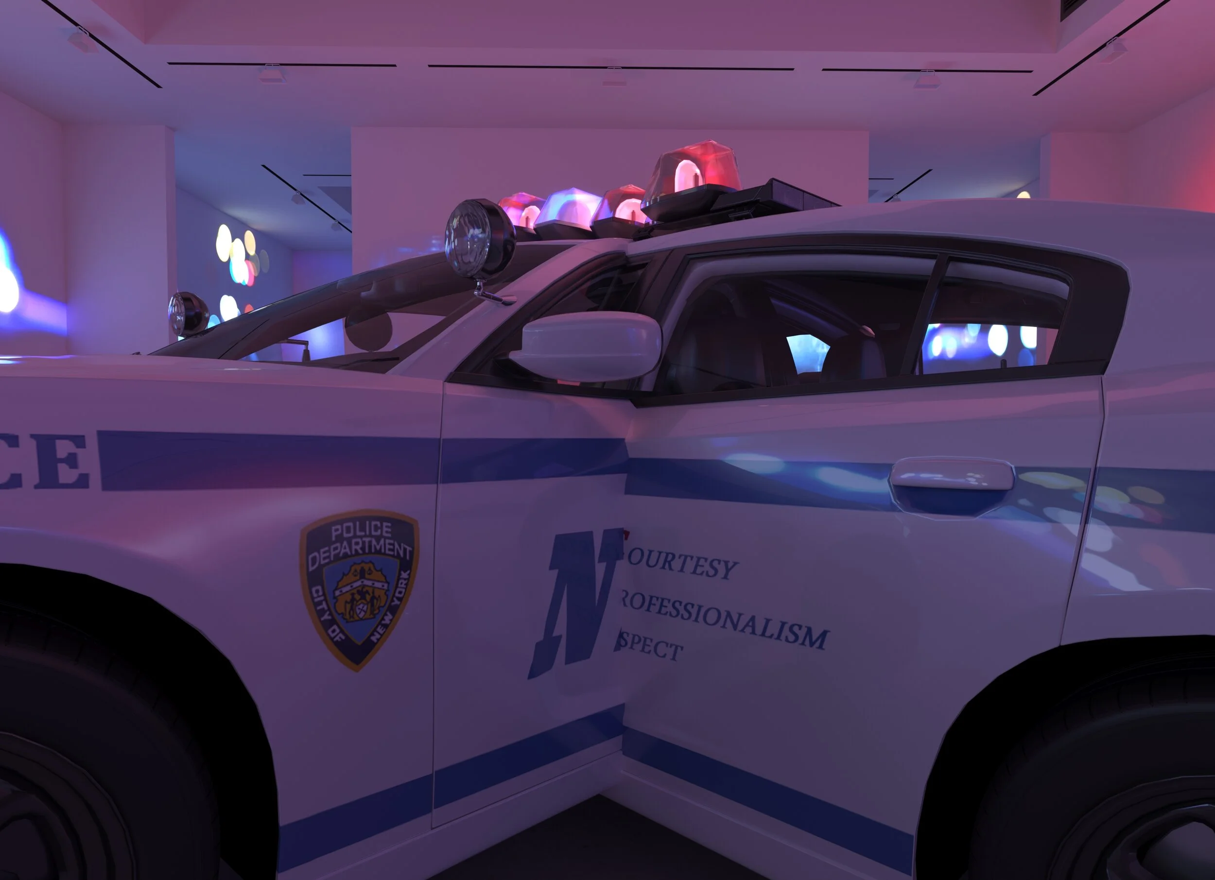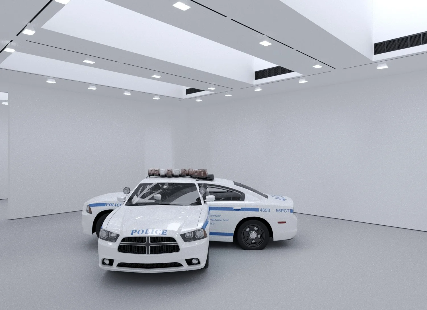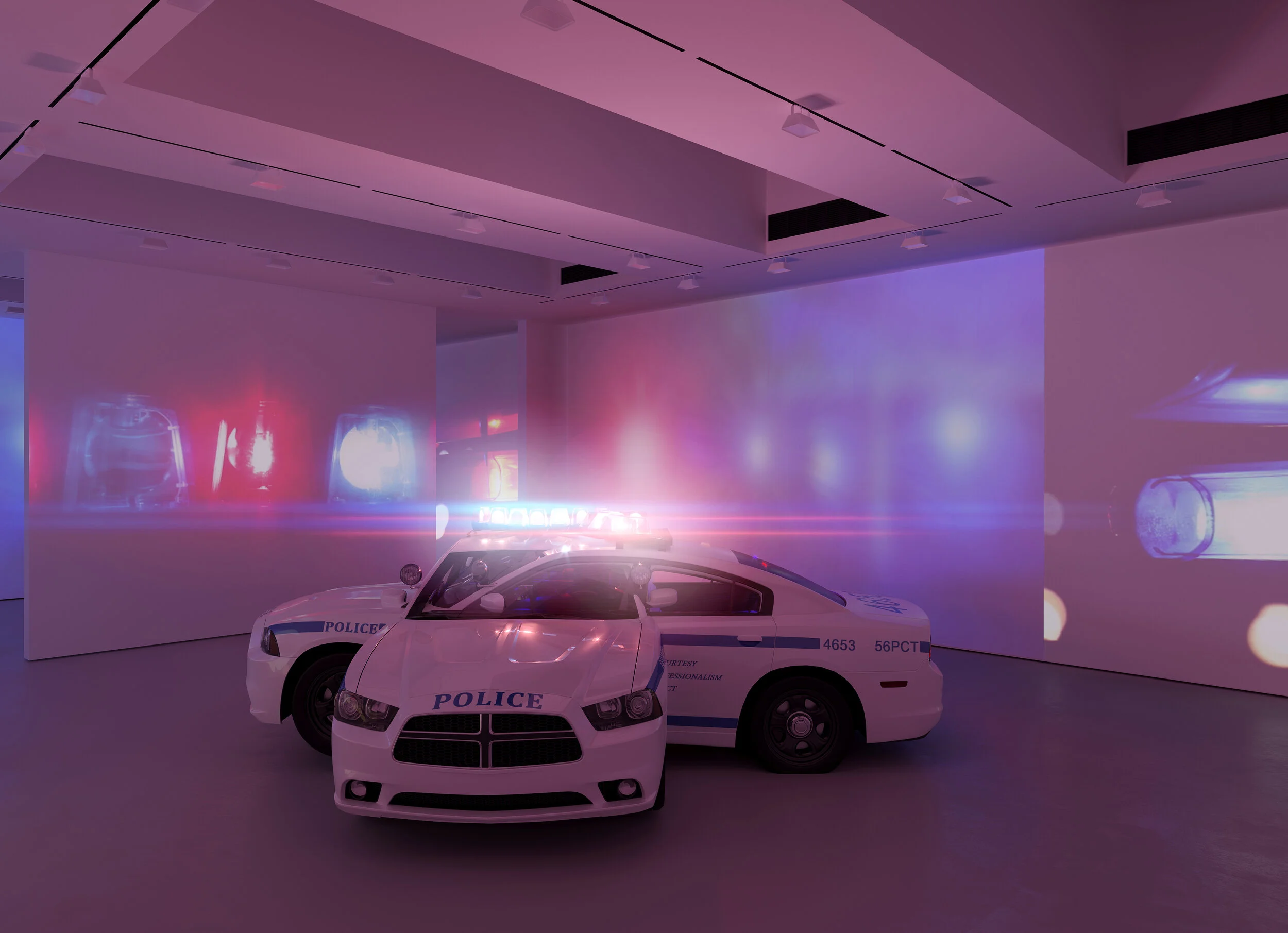 Conceived for the David Zwirner Gallery, AMERICA: State of Emergency is a deafening auditory and visual assault on the senses, an immersive environment of chaos and mayhem. Two perfectly fused NYPD Police Cruisers sit at the center of a series of film projections, which start with one flashing light in the east and slowly take over the four walls with a discordant collage of police cars, fire trucks and emergency service vehicles' flashing lights and sirens. The projections gradually build in intensity from thrilling to terrifying as the colors become more hallucinatory, images break down to abstraction, flashing lights morph into dazzling strobes and the soundtrack rises to an mind numbing 120 decibels.This installation is a machine for accelerating the transformation of news coverage into panic. The projections use found footage in homage to director Kenneth Anger's stylized, hypnotic vision. The films mimic public hysteria caused by media over-saturation, causing rational judgement to give way to fear. The two merged police cars behave as if they are themselves immaterial projections that can pass through each other as easily as light. In a world where the real and the virtual become indistinguishable, the police cars seem to speed through each other, ominously merging into the shape of a post-truth crucifixion accident.