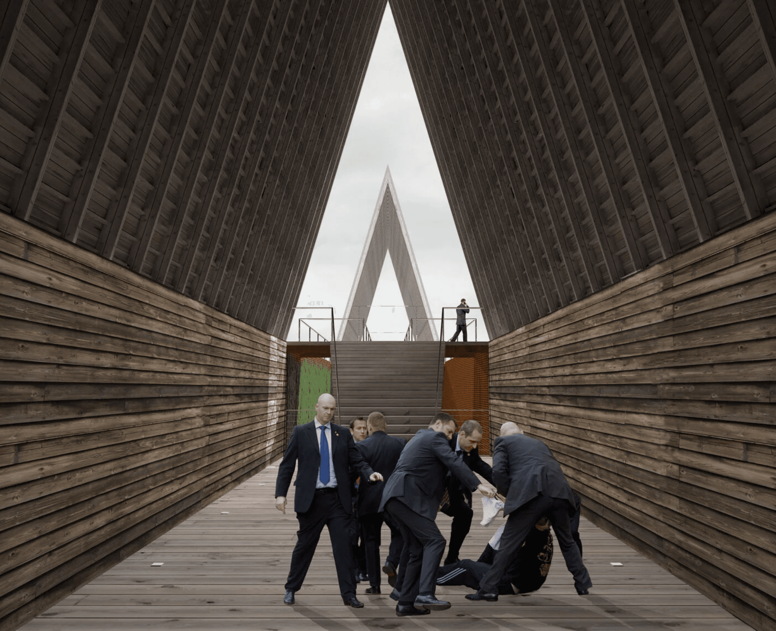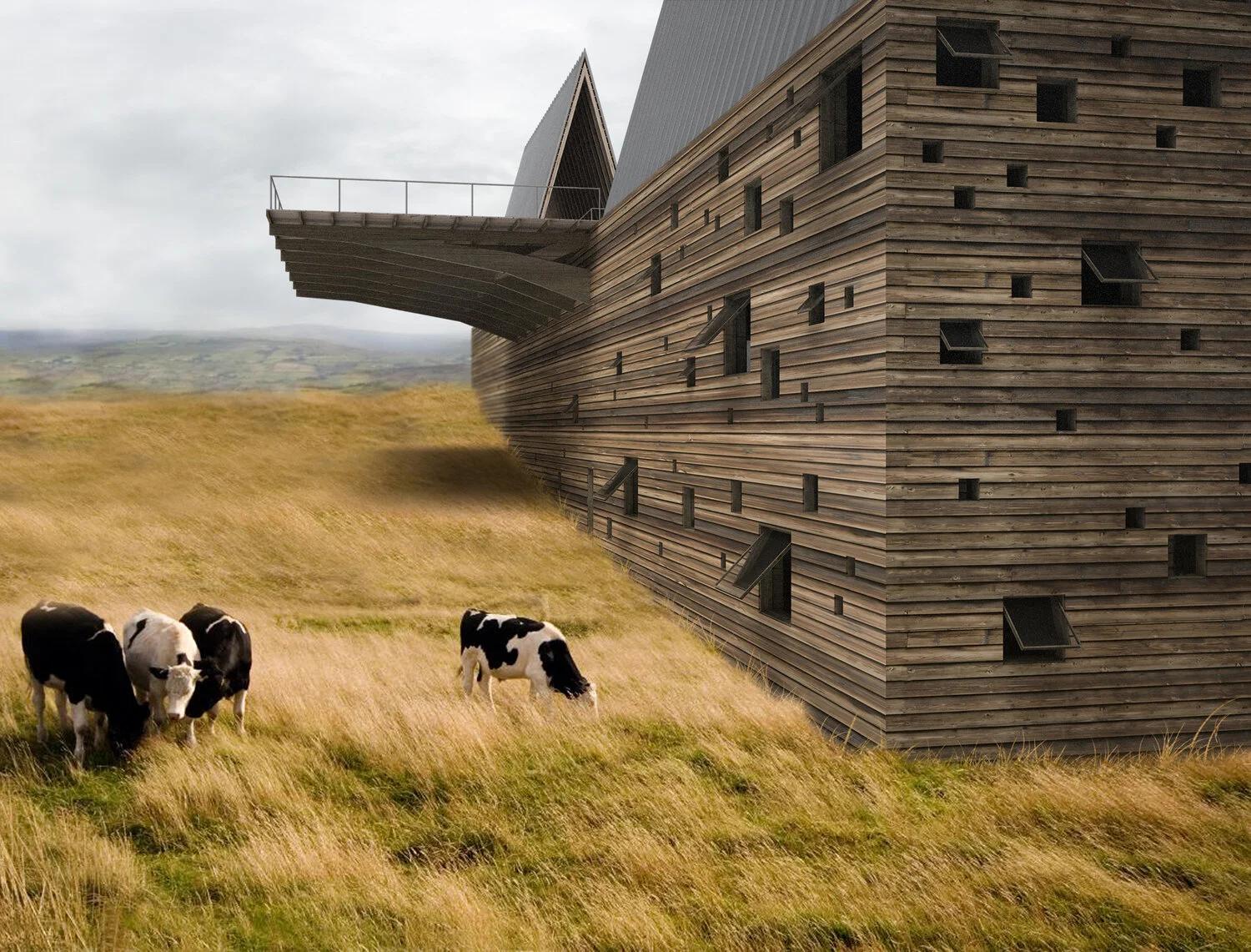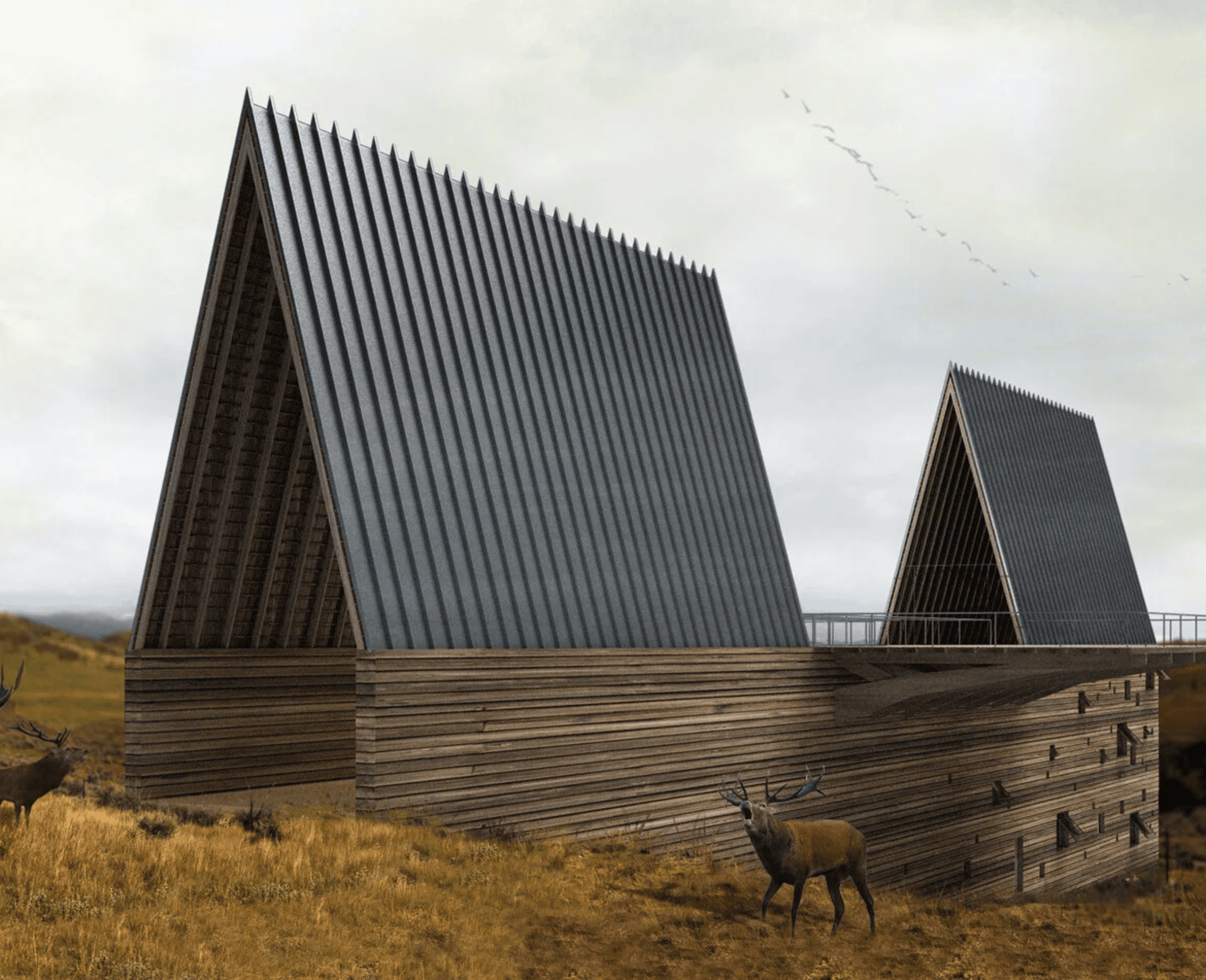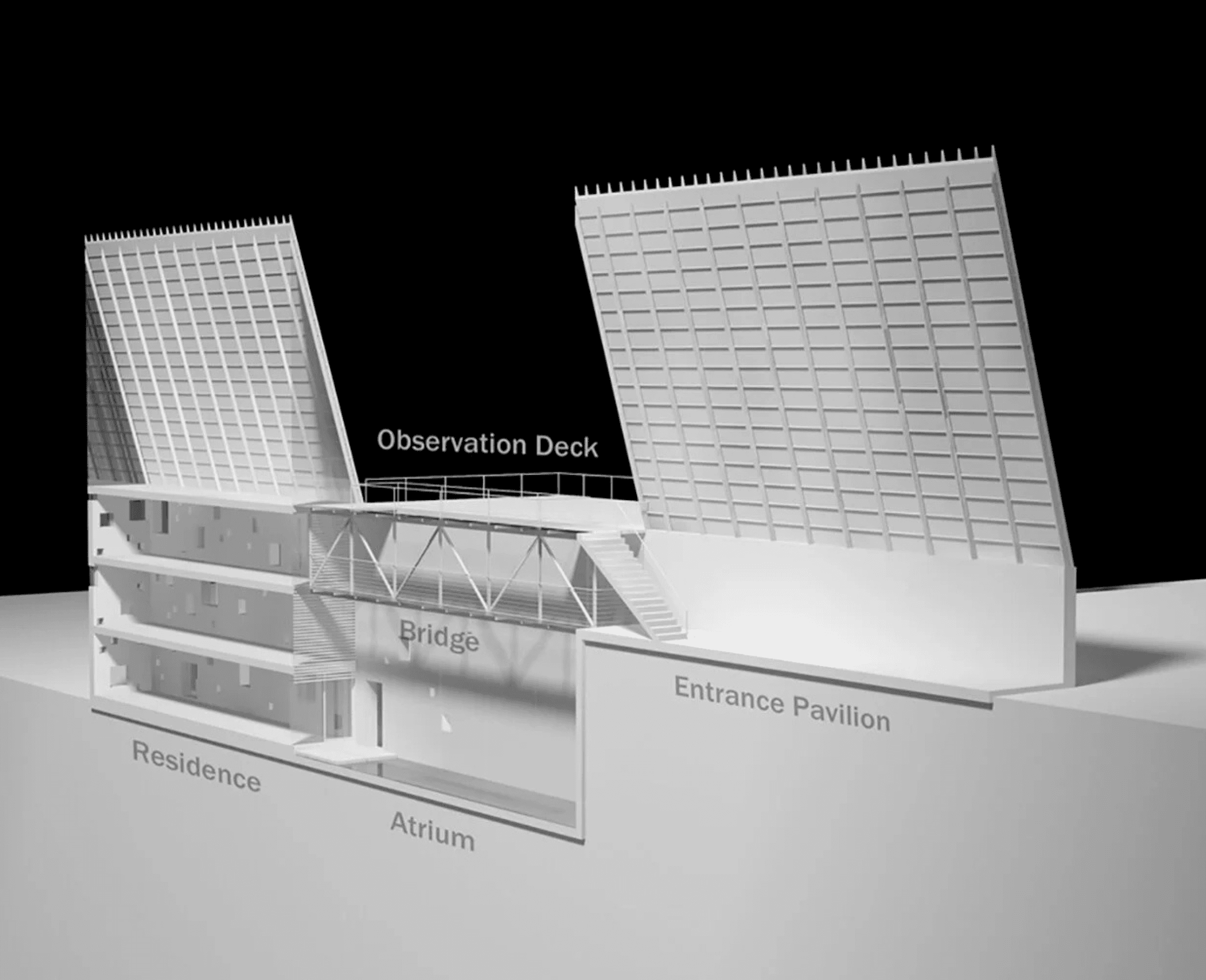 For this residential proposal in Montana's Madison Valley, Axis Mundi used a tried and true technique-taking design cues from rural buildings common to the landscape-but tweaked it by creating, in effect, a "barn with a view." And a spectacular view it is. Bisecting the basic peaked form with a nearly 4,800 square-foot observation deck allows breathtaking outdoor viewing of Big Sky Mountain and Beaver Head National Forest. The half that emerges from the bluff, which could also recall a covered bridge, serves as an entry pavilion. One can either step up to the observation deck from here or enter a 60-foot Cor-ten steel-and-glass bridge tucked under the stairs that overlooks a 3-story interior atrium and leads to the main living spaces in the other half of the structure. Underneath these are two floors of more private quarters. All rooms, however, have views: either out over the windswept valley or into the atrium. Geothermal heating and cooling, photovoltaic panels and high-performance building materials also ensure near-zero sustainability.Total Area: 10,200 sq. ft. including 4,800 sq. ft. observation deck.
