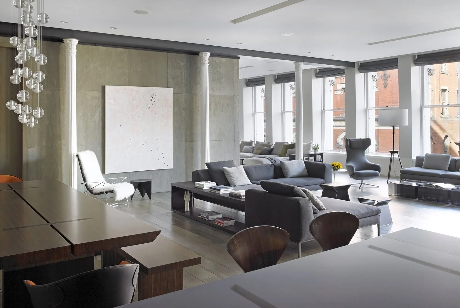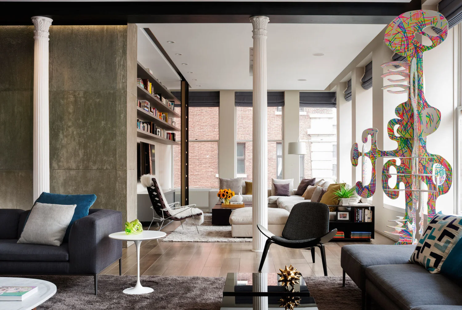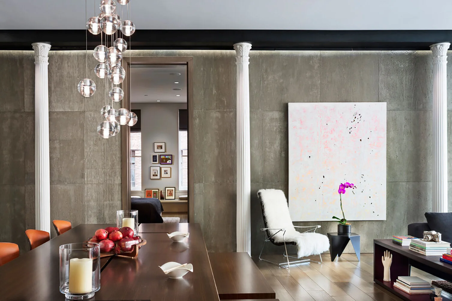 This NoHo apartment, in a landmarked circa 1870 building designed by Stephen Decatur Hatch and converted to lofts in 1987, had been interestingly renovated by a rock musician before being purchased by a young hedge fund manager and his gallery director girlfriend. Naturally, the couple brought to the project their collection of painting, photography and sculpture, mostly by young emerging artists (Eddie Martinez, Aaron Curry, Adam Pendelton, Sam Curry, and Jung Lee). Axis Mundi accommodated these pieces within a neutral palette accented with occasional flashes of bright color that referenced the various artworks. Major furniture pieces — a sectional in the library, a 12-foot-long dining table-along with a rich blend of textures such as leather, linen, fur and warm woods, helped bring the sprawling dimensions of the loft down to human scale.