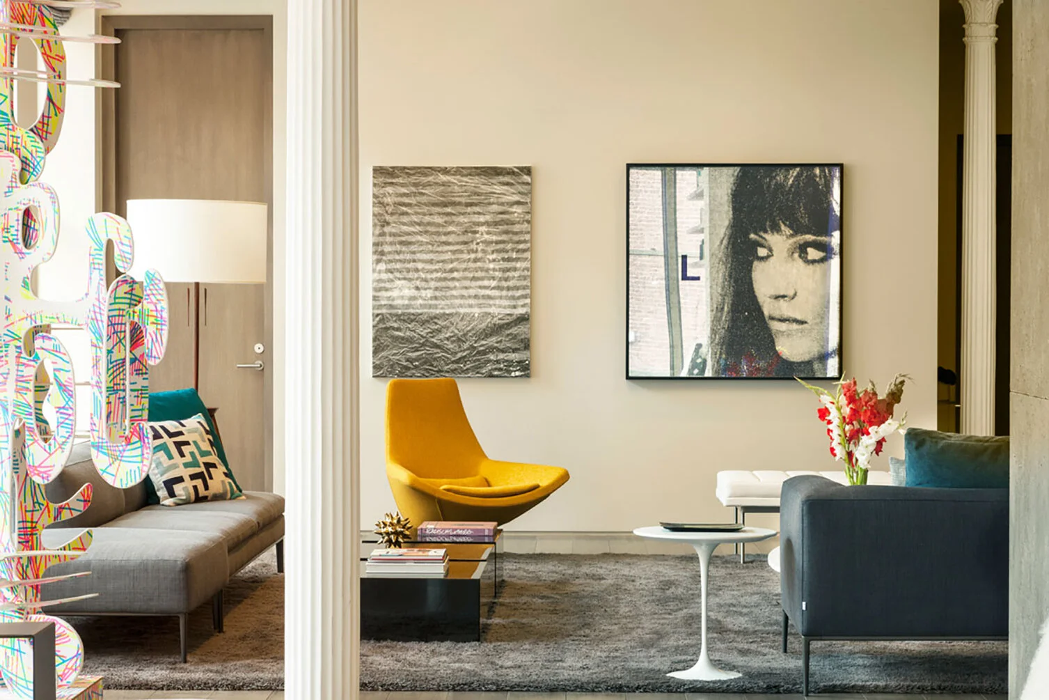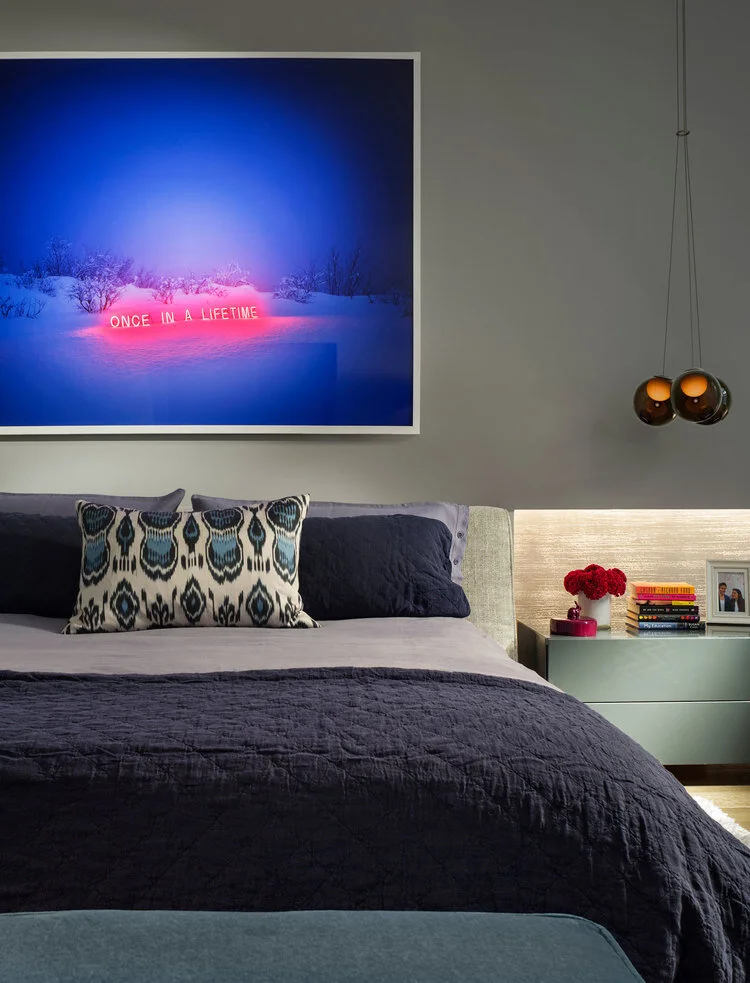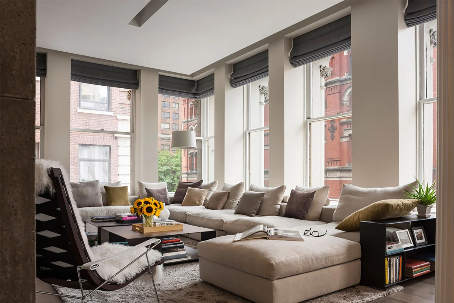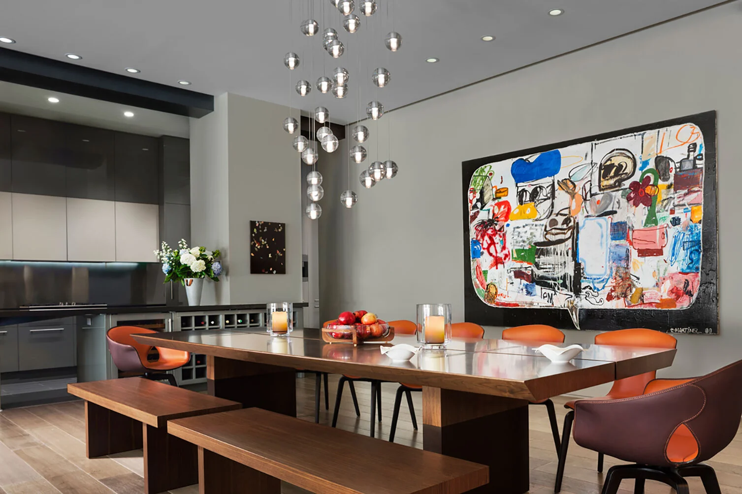 This NoHo apartment, in a landmarked circa 1870 building designed by Stephen Decatur Hatch and converted to lofts in 1987, had been interestingly renovated by a rock musician before being purchased by a young hedge fund manager and his gallery director girlfriend. Naturally, the couple brought to the project their collection of painting, photography and sculpture, mostly by young emerging artists (Eddie Martinez, Aaron Curry, Adam Pendelton, Sam Curry, and Jung Lee). Axis Mundi accommodated these pieces within a neutral palette accented with occasional flashes of bright color that referenced the various artworks. Major furniture pieces — a sectional in the library, a 12-foot-long dining table-along with a rich blend of textures such as leather, linen, fur and warm woods, helped bring the sprawling dimensions of the loft down to human scale.