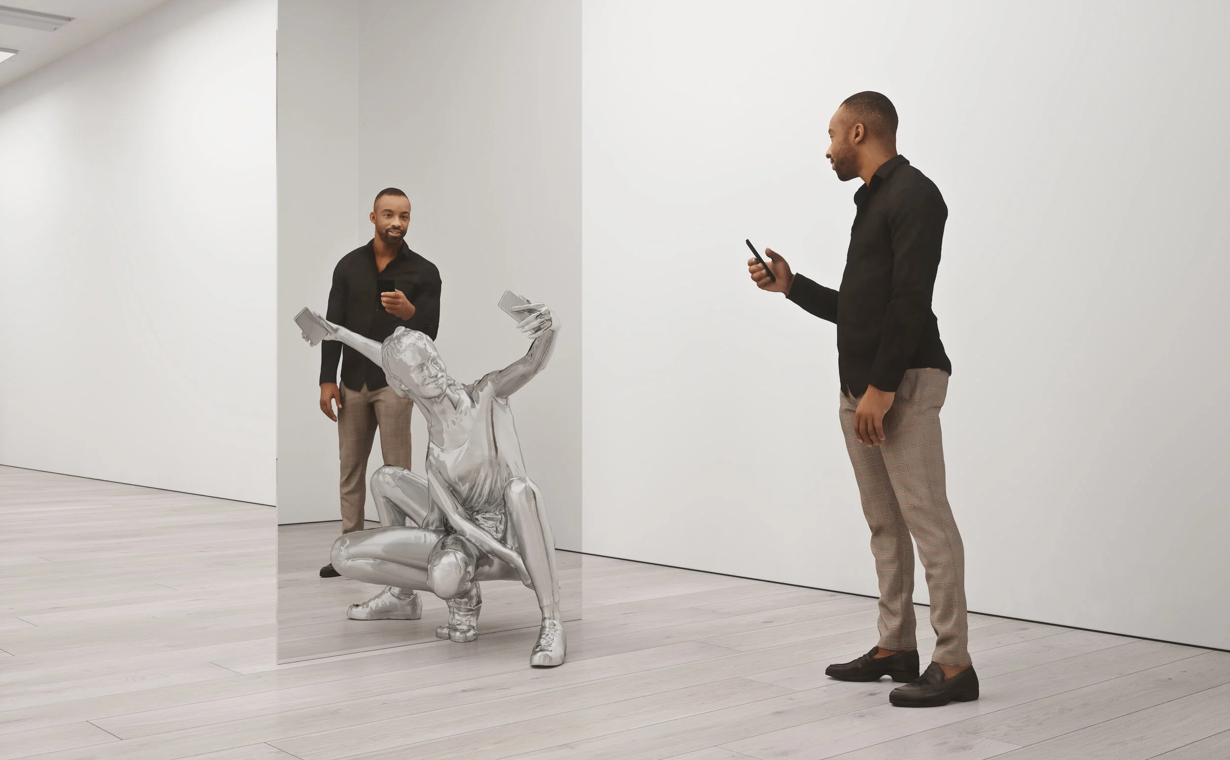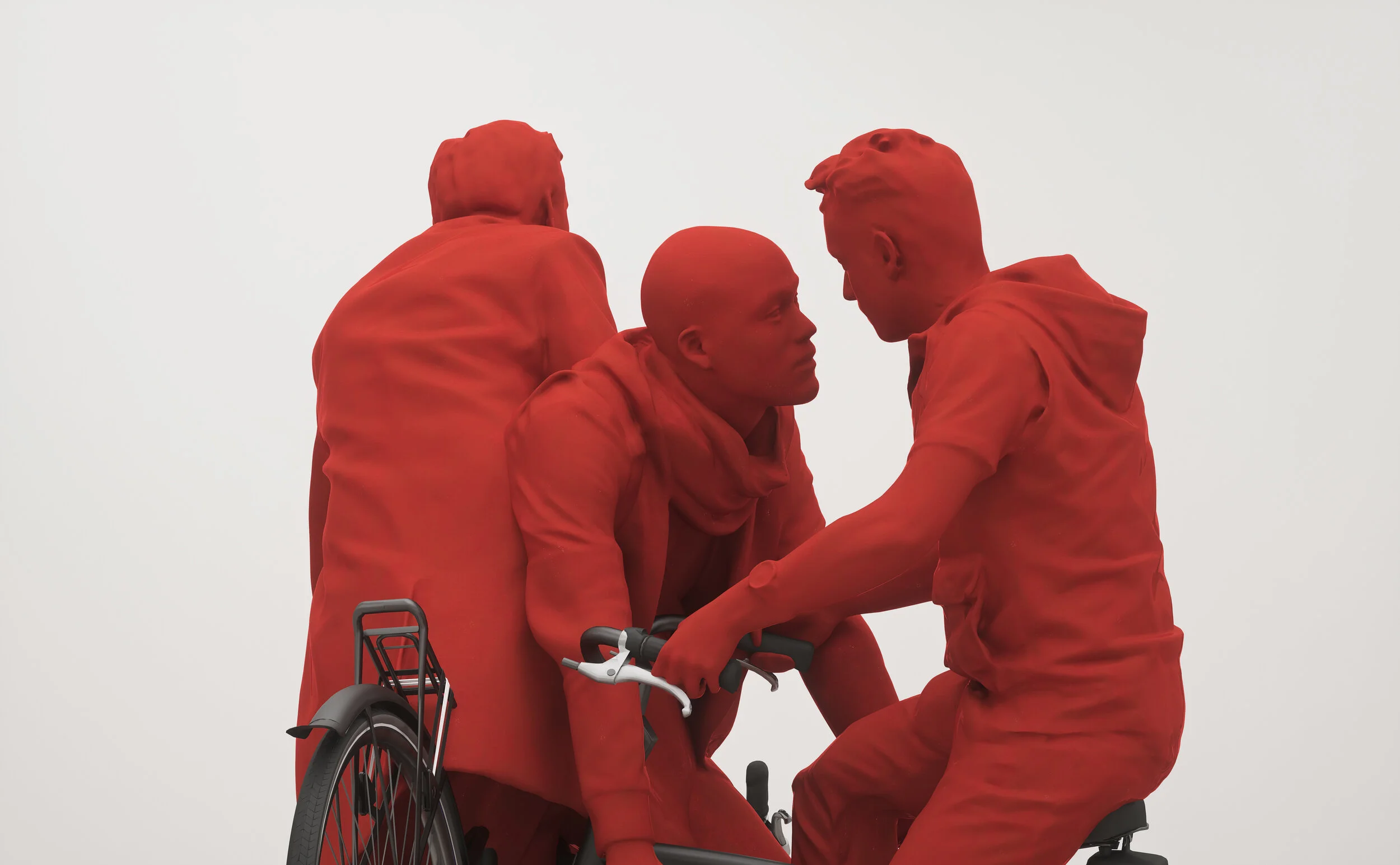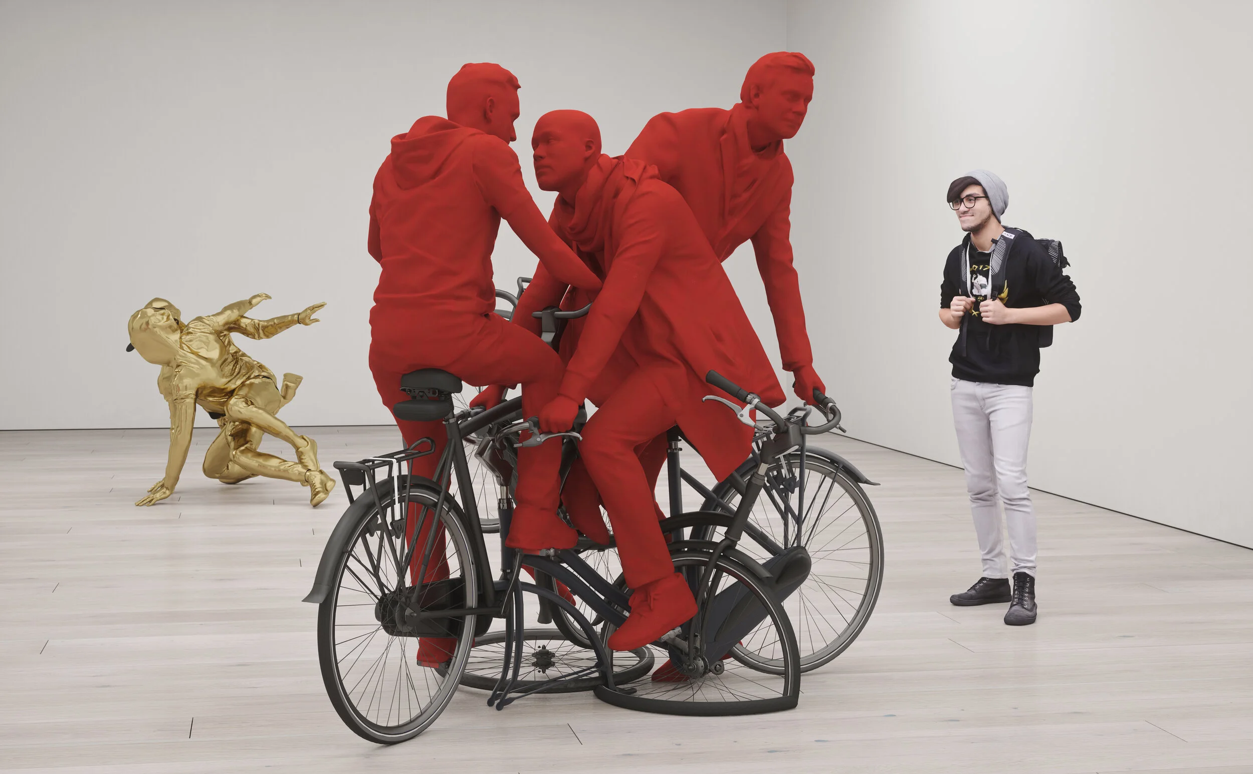 "A body only exists to be other bodies" William S. Burroughs, The Electronic Revolution Other Bodies + Antibodies is a Burroughsian slip on a banana peel, transgressing the real and the imaginary, while blurring the boundaries between what is material and immaterial in contemporary culture.The exhibition consists of four mind warping sculptures - Woman Taking a Selfie Bisected by a Mirror (The Mirror Stage), Gold Hip-Hop Dancer In Relative Simultaneity, Virtual Reality Expedition in Grand-Antique d'Aubert (The Lovers), and The Three Red Bicyclists, or Menage Trois.