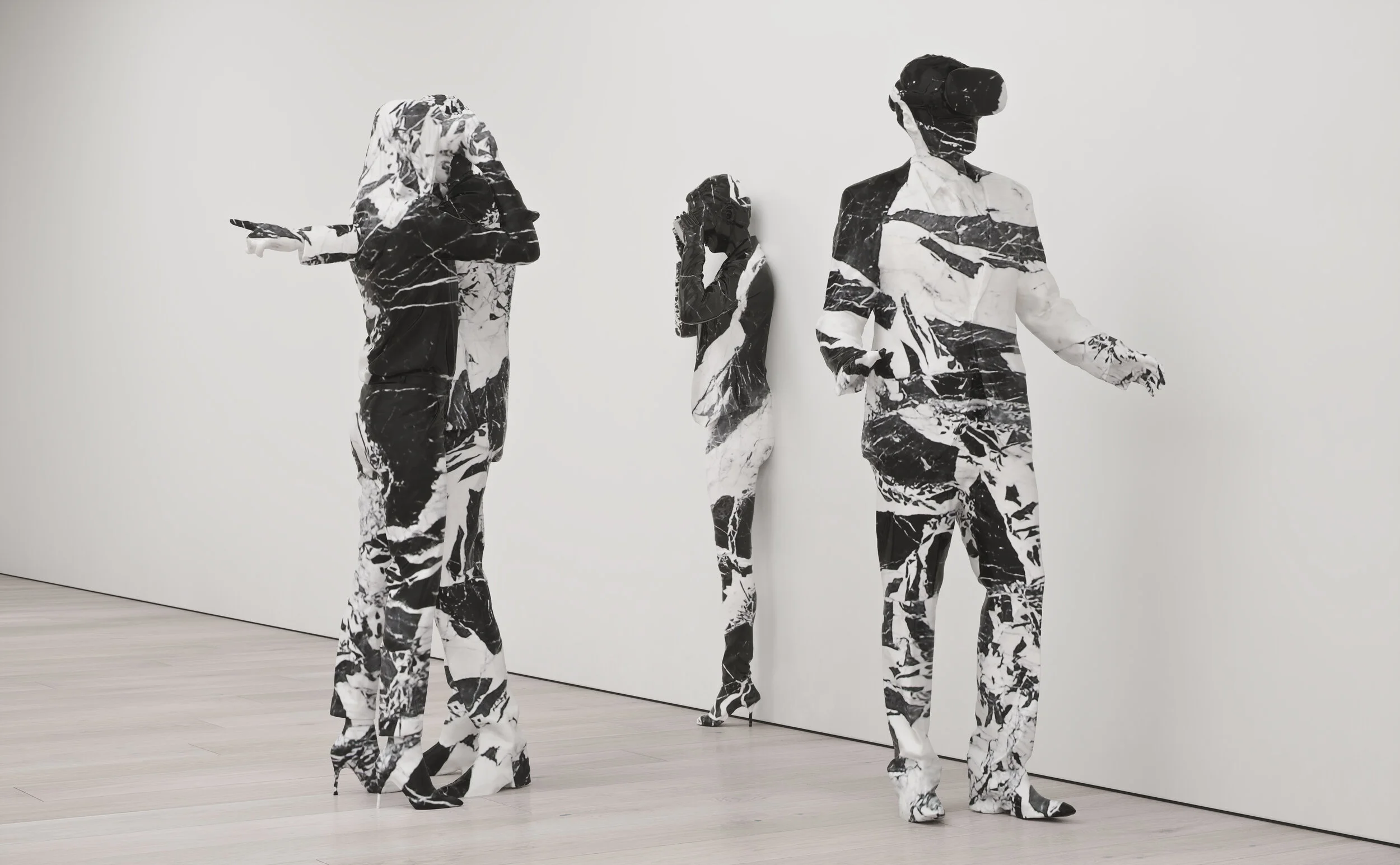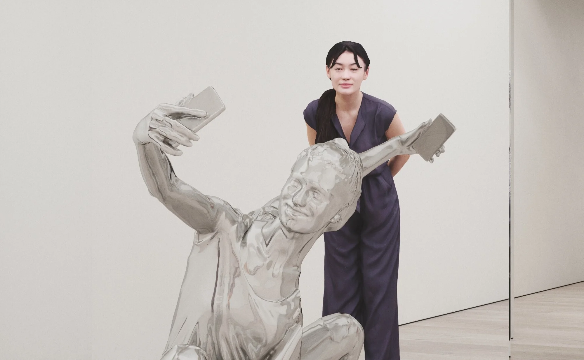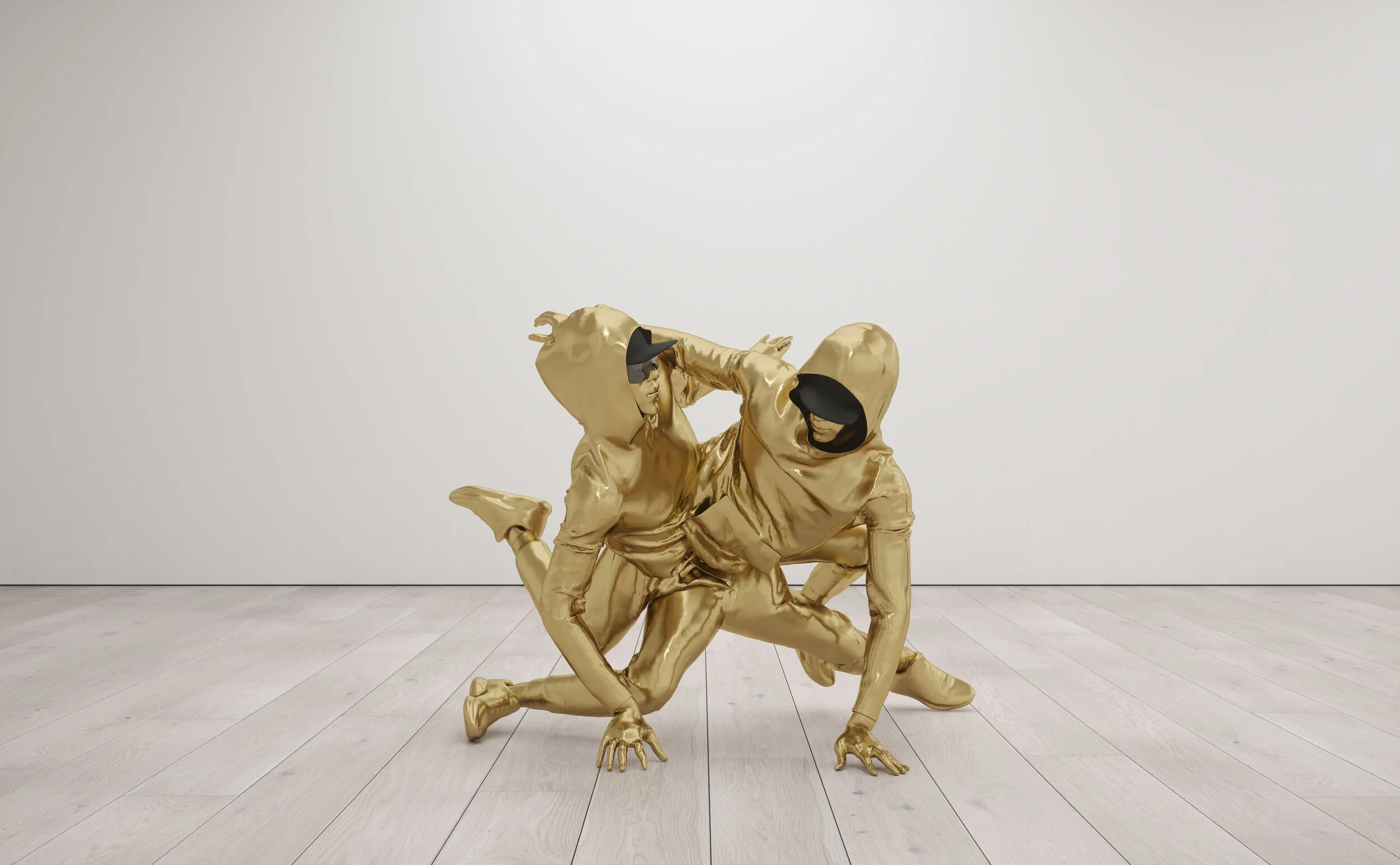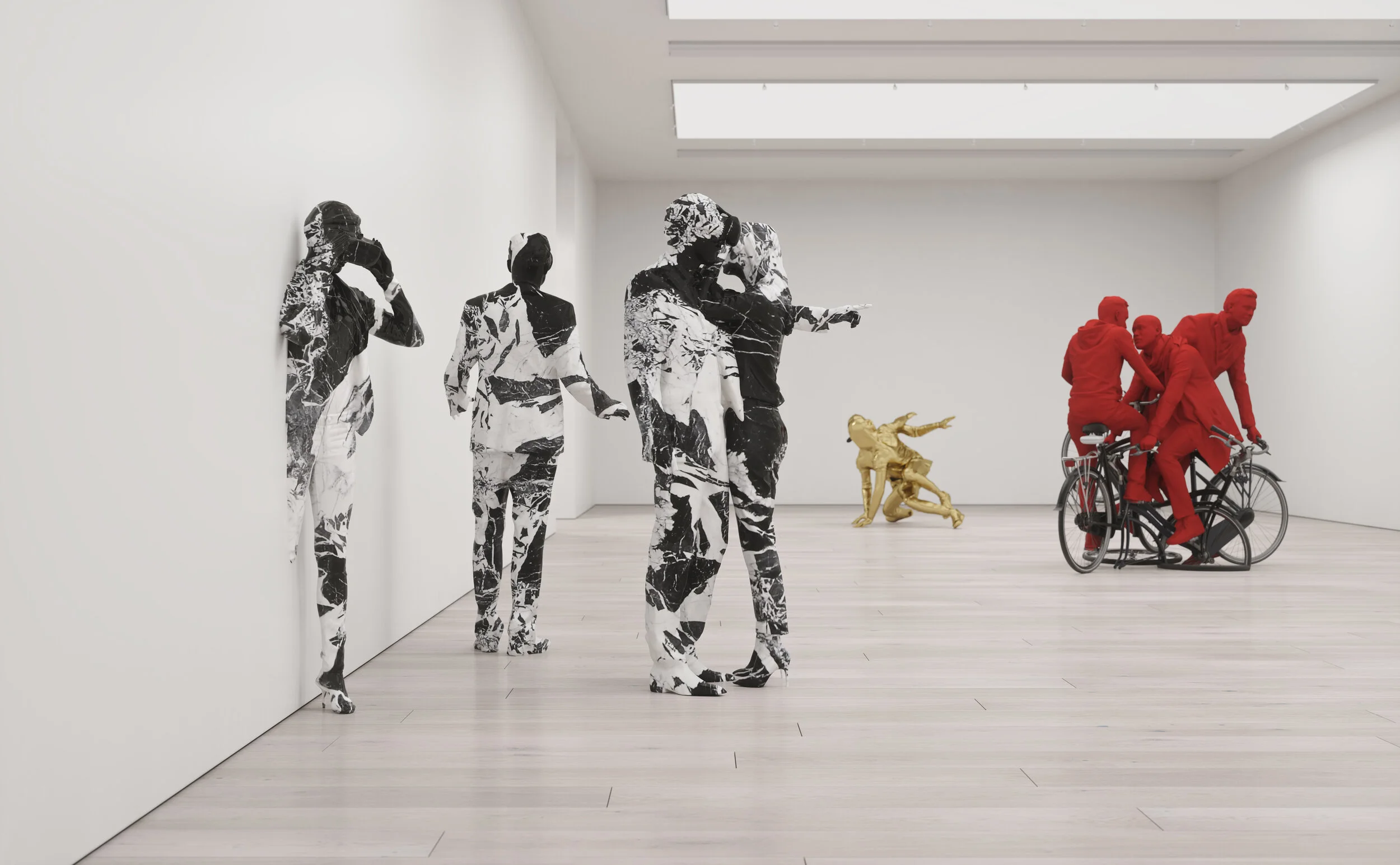 "A body only exists to be other bodies" William S. Burroughs, The Electronic Revolution Other Bodies + Antibodies is a Burroughsian slip on a banana peel, transgressing the real and the imaginary, while blurring the boundaries between what is material and immaterial in contemporary culture.The exhibition consists of four mind warping sculptures - Woman Taking a Selfie Bisected by a Mirror (The Mirror Stage), Gold Hip-Hop Dancer In Relative Simultaneity, Virtual Reality Expedition in Grand-Antique d'Aubert (The Lovers), and The Three Red Bicyclists, or Menage Trois.